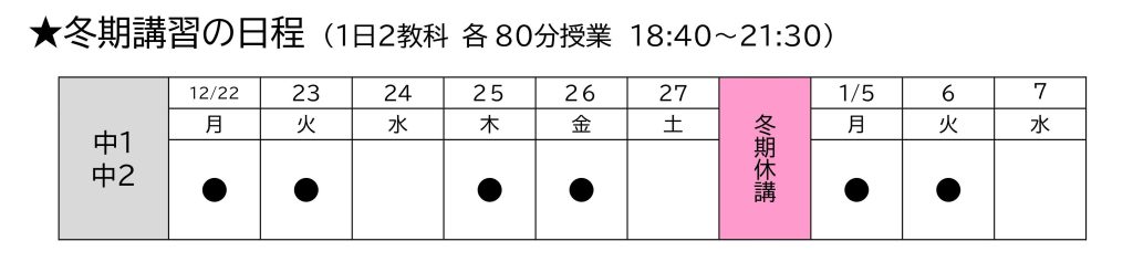 冬期講習の日程  1日2教科、各80分授業
