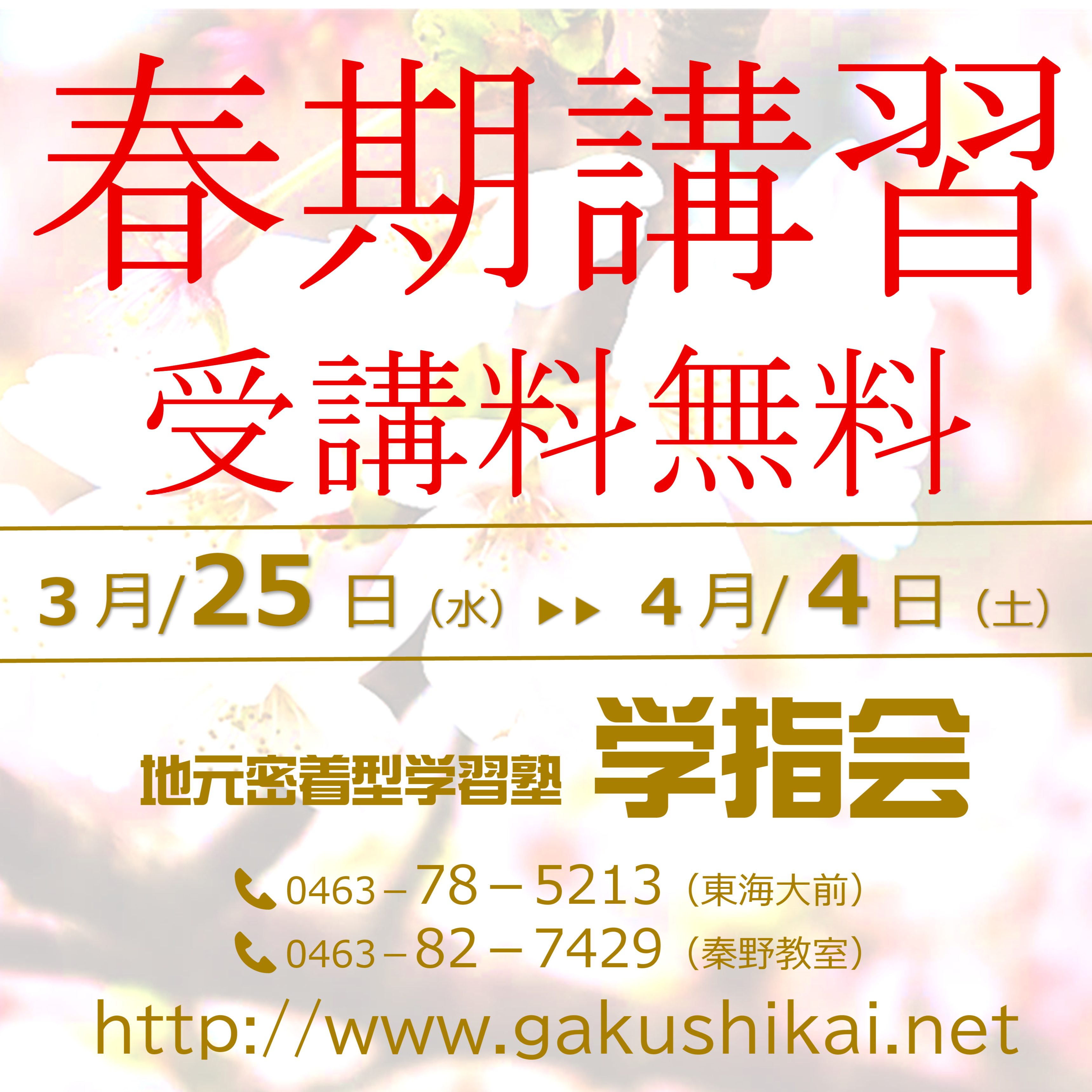 秦野教室は「マンツーマン授業」または「自立型個別指導」になります。春期講習期間も3月25日(水)~4月4日(土)で授業をおこないます。