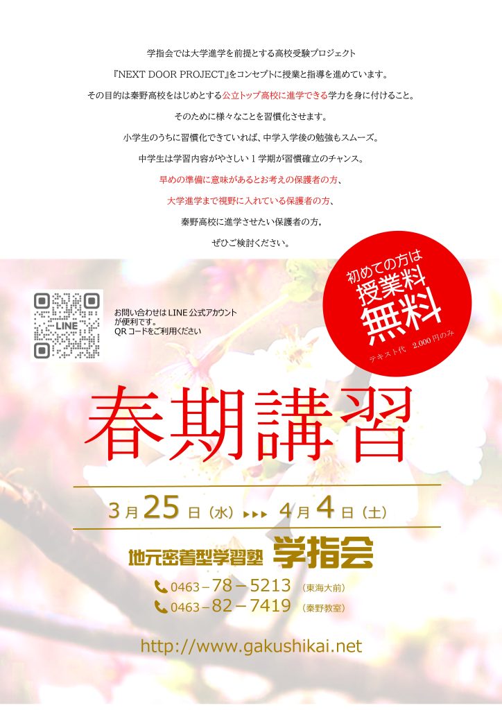 秦野教室は「マンツーマン授業」または「自立型個別指導」になります。春期講習期間も3月25日(水)~4月4日(土)で授業をおこないます。