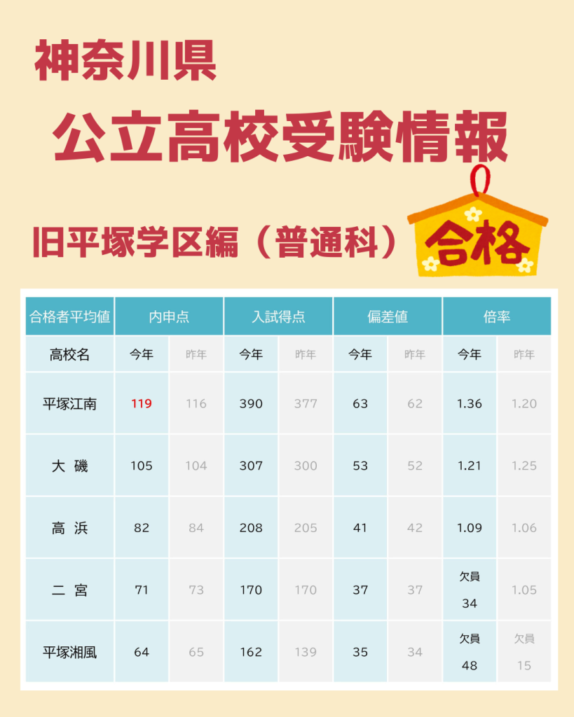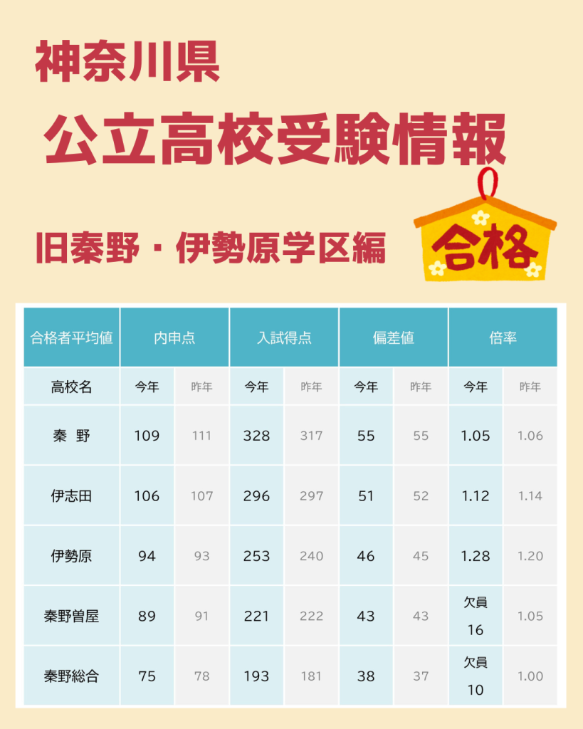 個人的には私たち近隣の地区の高校の多くは、昨年と大きく変わらないと予想します。伊勢原高校が少し落ち着き、大磯高校の人気がまだ上がる可能性があると予測します。模試の結果から、秦野高校は昨年よりも志願者が増えているようですが、倍率1.2倍を超すことはないように思います。伊志田高校と西湘高校は定員が増えたことで、倍率は昨年よりも落ち着くと予想できます。