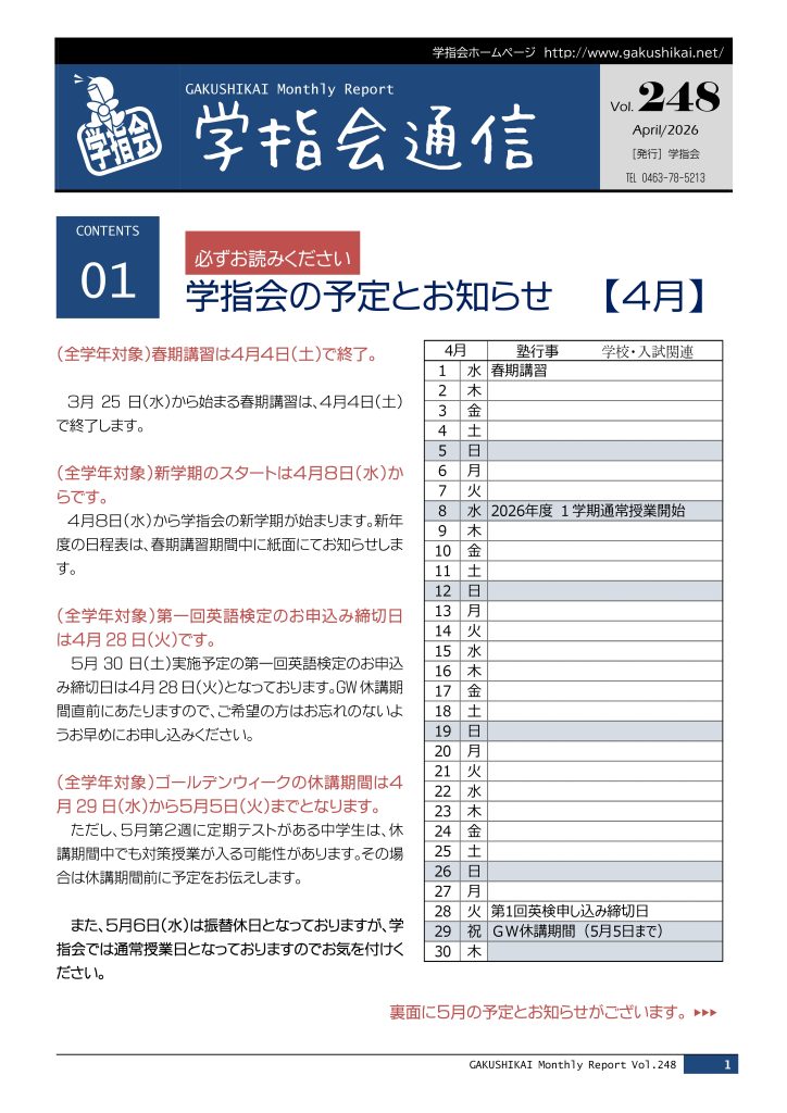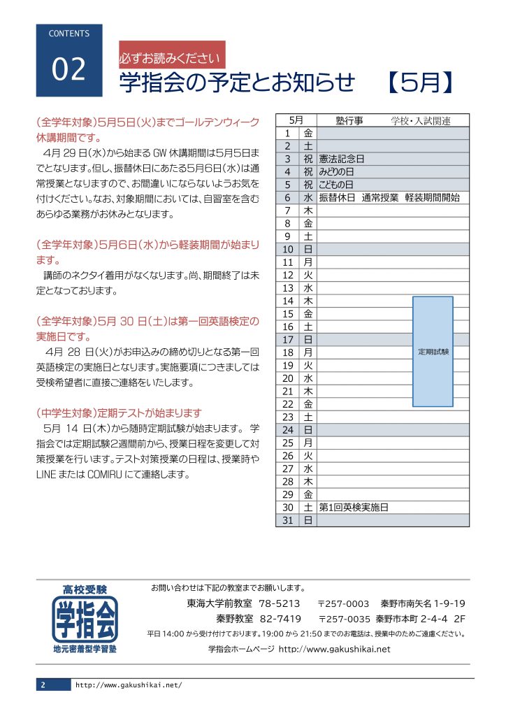 学指会では以下の期間をゴールデンウイーク休講としています。全学年の通常授業がお休みとなり、自習室の利用もできません。ご承知ください。